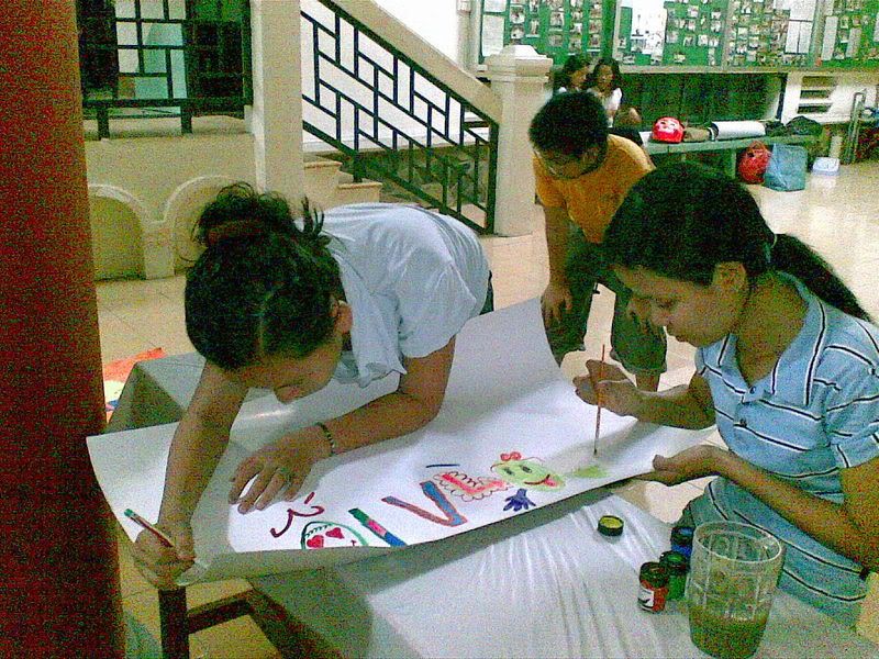 Đây là seires hình làm gian hàng của mình hồi trung thu đó. Mình được giao gian hàng chụp hình lưu niệm cho các bé. Tức là các bé đến chụp hình trên nền phông vải trắng, sau đó về nhà mình sẽ lấy hình các bé ghép vào các khung sticker có sẵn (giống chụp hình Hàn Quốc vậy đó), có điều mình sẽ rửa hình cho các bé khổ lớn 10x15 chứ ko fải khổ nhỏ nhỏ như hình Hàn Quốc. Khâu chuẩn bị Chuẩn bị thì phải chuẩn bị rất nhiều thứ, nặng nhất vẫn là phần kê bàn, cột cây vào chân bàn để dựng thành một gian hàng, sau đó leo lên cao còn phải dựng bạt nữa chứ. Nhóm mình có 3 người, 1 nam và 2 nữ nhưng nam đó thì có cũng như ko vì nam đó học Mỹ Thuật, suốt ngày tô vẽ cho cái bảng hiệu và còn tô dùm cho tổ khác nữa chứ, trong khi gian hàng của mình chưa xong, bó tay. Vì thế mình phải làm hết từ đầu đến cuối từ dựng cọc, dựng bạt, xếp bàn, xếp ghế,…. Khâu này mệt và nắng quá nên không chụp hình được. Đến tối thì mình mới bắt tay vào tô vẽ cái cổng ra vào, cũng đẹp hết chê nhé, hehehe!